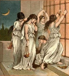 Jesús dijo a sus discípulos esta parábola: "El Reino de los cielos se parecerá a diez doncellas que tomaron sus lámparas y salieron a esperar al esposo. Cinco de ellas eran necias y cinco eran sensatas. Las necias, al tomar las lámparas, se dejaron el aceite; en cambio, las sensatas se llevaron alcuzas de aceite con las lámparas. El esposo tardaba, les entró sueño a todas y se durmieron. A medianoche se oyó una voz: "¡Que llega el esposo, salgan a recibirlo!" Entonces se despertaron todas aquellas doncellas y se pusieron a preparar sus lámparas. Y las necias dijeron a las sensatas: "Dennos un poco de su aceite, que se nos apagan las lámparas". Pero las sensatas contestaron: "Por si acaso no hay bastante para ustedes y nosotras, mejor es que vayan a la tienda y se lo compren". Mientras iban a comprarlo llegó el esposo, y las que estaban preparadas entraron con él al banquete de bodas y se cerró la puerta. Más tarde llegaron también las otras doncellas, diciendo: "Señor, señor, ábrenos". Pero él respondió: "Se los aseguro: no las conozco. Por tanto, velen, porque no saben el día ni la hora".